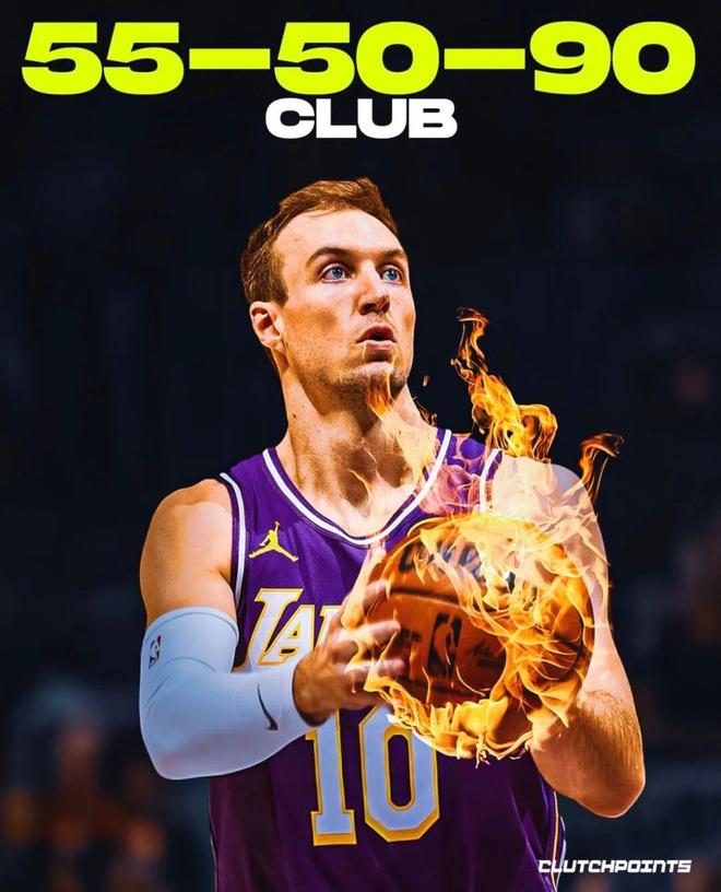 這組數據放在任何年代都是頂級。更恐怖的是,如果把老鷹時期的46場也算上,他本賽季投籃54.4%,三分48.3%,罰球91.7%。距離曆史上第一個“55+50+90”賽季,隻差一步之遙。
