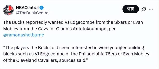 另外,Shelburne報道稱,雄鹿隊在字母哥的交易談判中,曾對兩位新星有興趣。“雄鹿隊感興趣的球員是更年輕的建隊基石型球員,比如76人的埃奇庫姆,或是騎士的莫布利。”