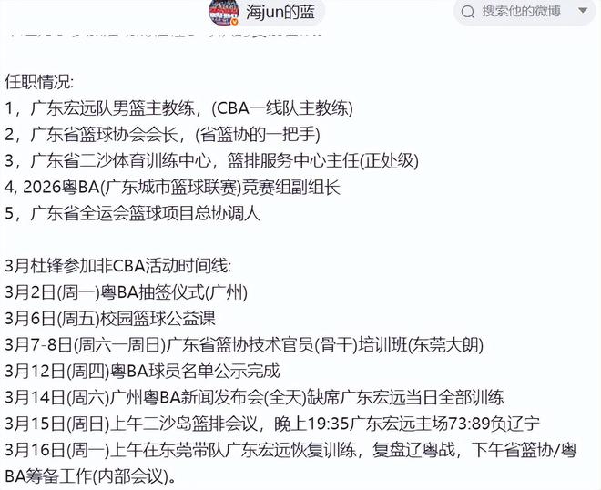 賽後關鍵的來了,“海jun的藍”曬出了杜鋒的任職情況以及最近的行程安排,給出了廣東隊本場比賽失利以及近期球隊戰績低迷的真正原因。