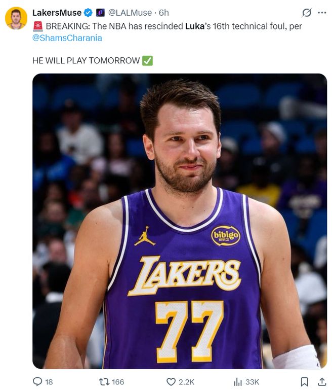 湖人13戰12勝兩點聯盟前5!東契奇場均36+8+7 取消技犯引名嘴不滿
