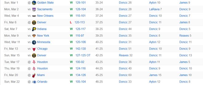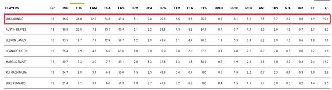 這13場比賽東契奇沒有休息任何一場,場均36.5分鍾,拿到36分8.3籃板7.55助攻2.2搶斷0.8蓋帽,命中率49.4%,三分命中率39.8%,場均命中5.1個三分球。