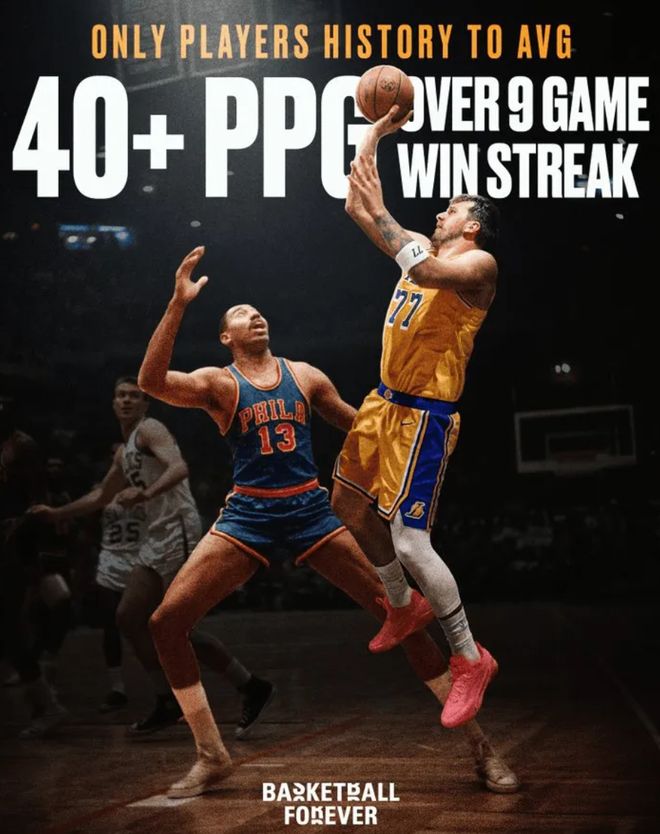 湖人目前正值一波九連勝,東契奇場均出戰 37.5 分鍾,拿到 40 分 8.4 籃板 7.4 助攻 2.6 搶斷 0.9 蓋帽,投籃命中率 49%,三分命中率 40.3%。他成為張伯倫後首位9連勝期間能場均拿到至少40分以上的球員。