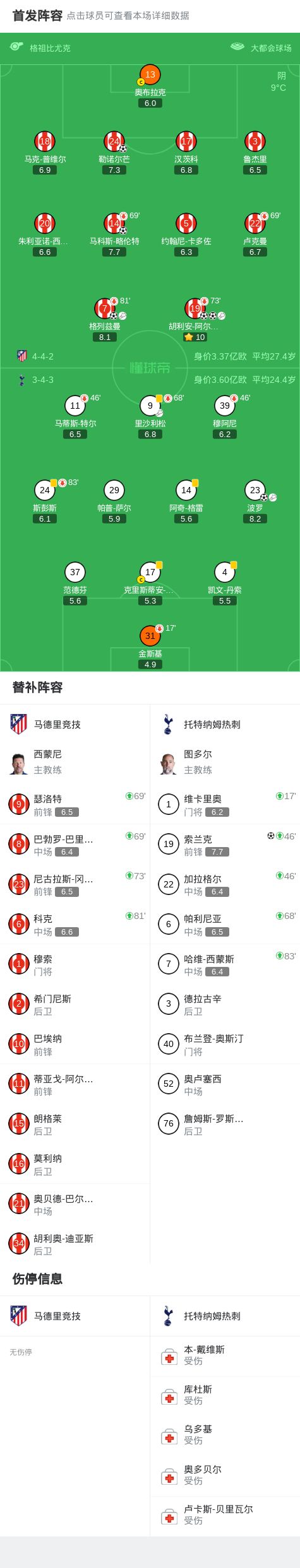 北京時間3月11日4:00,歐冠1/8決賽首回合,馬德裏競技坐鎮利雅得航空大都會球場迎戰托特納姆熱刺,本場主裁判為格祖比尤克。上半場,熱刺首發門將金斯基兩送大禮後被換下,馬競多點開花,略倫特、格列茲曼、阿爾瓦雷斯、勒諾爾芒先後破門,波羅扳回一城。下半場,阿爾瓦雷斯奔襲再下一城,索蘭克替補破門。最終,馬競主場5-2熱刺。