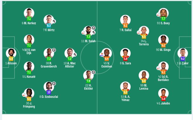 加拉塔薩雷首發:1-恰基爾、90-辛格、42-巴爾達克徹、4-伊斯梅爾·雅各布斯、93-博伊(46’77-諾阿·朗)(80’9-伊卡爾迪)、34-托雷拉(60’11-阿克金)、99-勒米納、8-加布裏埃爾·薩拉、53-伊爾馬茲、7-紹洛伊、45-奧斯梅恩(46’10-薩內)