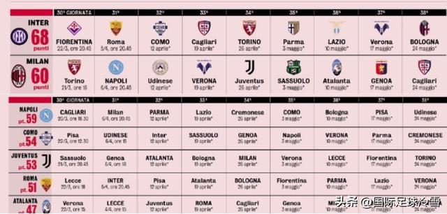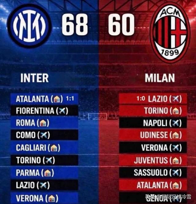 相對而言,國米最後階段要對陣佛羅倫薩等拚保級的球隊,要對上羅馬、科莫等為歐冠資格玩命的球隊。AC米蘭則要同那不勒斯、尤文圖斯、亞特蘭大等多支爭奪歐戰資格的對手捉對廝殺。