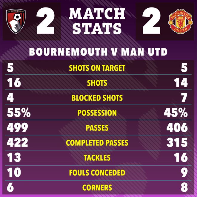 曼聯重新領先後5分鍾,伯恩茅斯就創造了扳平的機會。斯科特禁區前轉身起腳,曼聯竟無人防守,幸好他射出的皮球擊中了右側立柱彈出!
