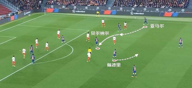 尤其是亞馬爾持球從邊路內切時,當佩德裏向外線走,對方注意力自然會被帶走,於是前頂到禁區前的貝爾納爾就有了用武之地。