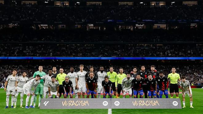 在伯納烏球場的馬德裏德比開始前,皇家馬德裏和馬德裏競技的球員以及裁判團隊與一幅標語牌合影,以支持當天開展的反種族主義宣傳運動。