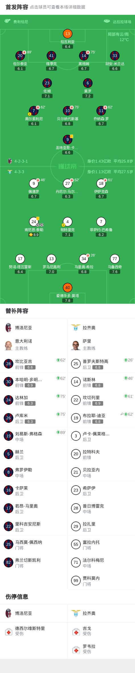 - 博洛尼亞0-2拉齊奧,泰勒破門,奧爾索利尼失點